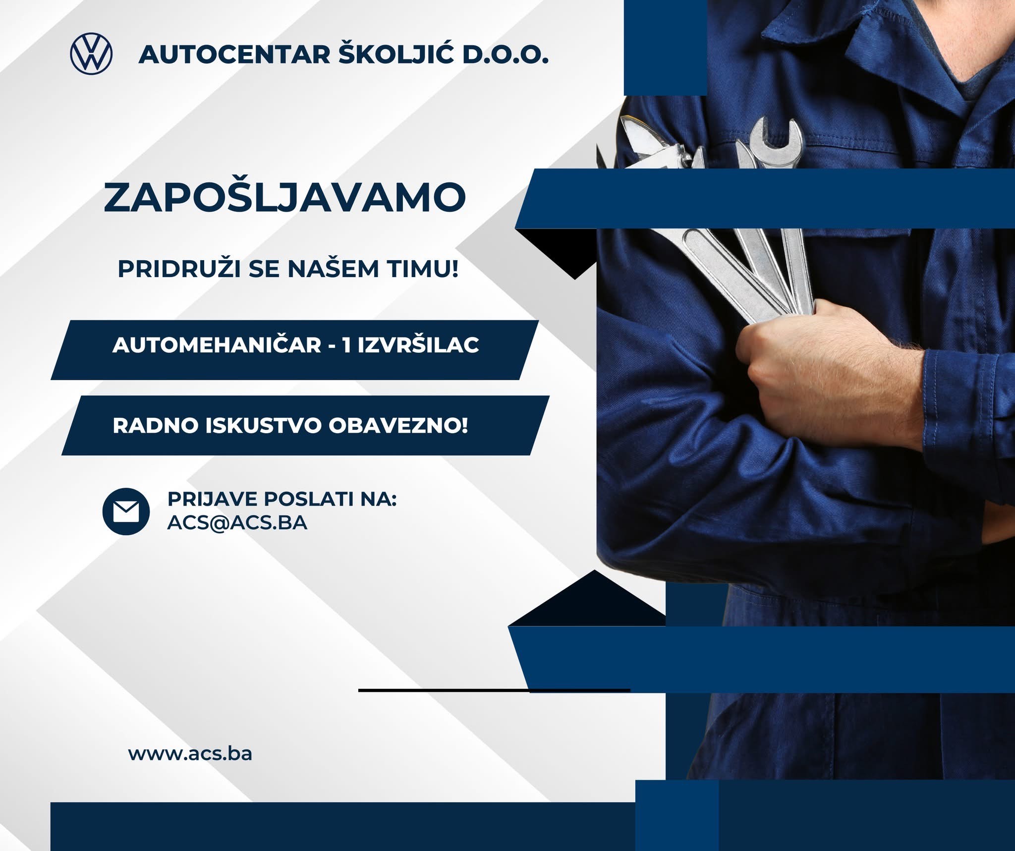 Autocentar Školjić d.o.o. na osnovu ukazane potrebe raspisuje oglas za prijem na slijedeću radnu poziciju: